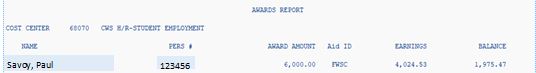In the example, Paul Savoy has two Cost Centers, but a total Work-Study award of $8000.00. Notice the Earnings within each Cost Center and the Balance attributed.