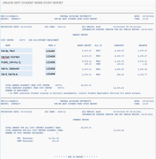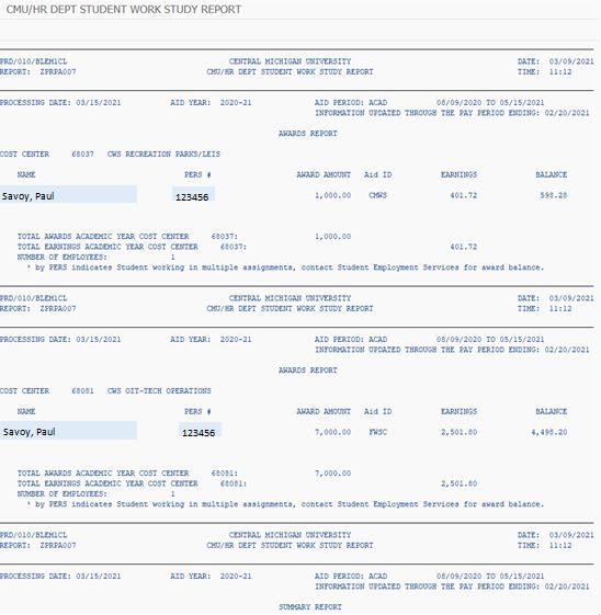 Student employees with Work-Study earnings in more than one department will appear on the report with EARNINGS from your cost center only; however, the AWARD AMOUNT will be the total for both departments.