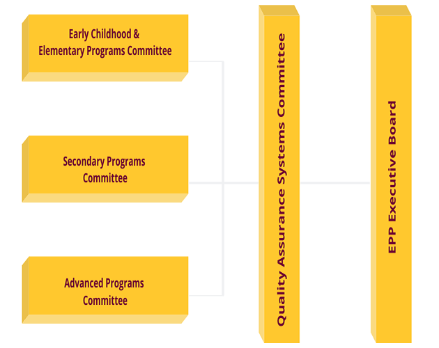 The Educator Preparation Programs (EPP) shared governance system is a five-committee structure organized into three levels as well as one advisory board. Each committee will hold responsibilities for reviewing all quality assurance functions of the EPP. These include assessment, curriculum, admissions, dispositions, alumni impact, recruitment, retention, clinical and continuous improvement initiatives.