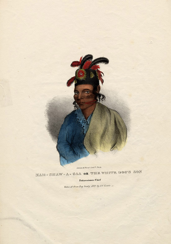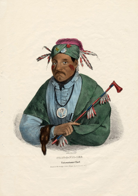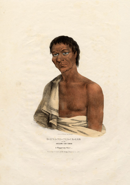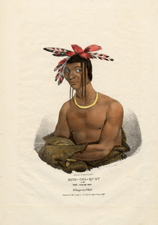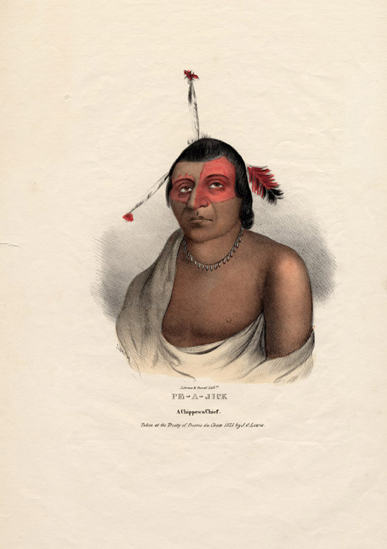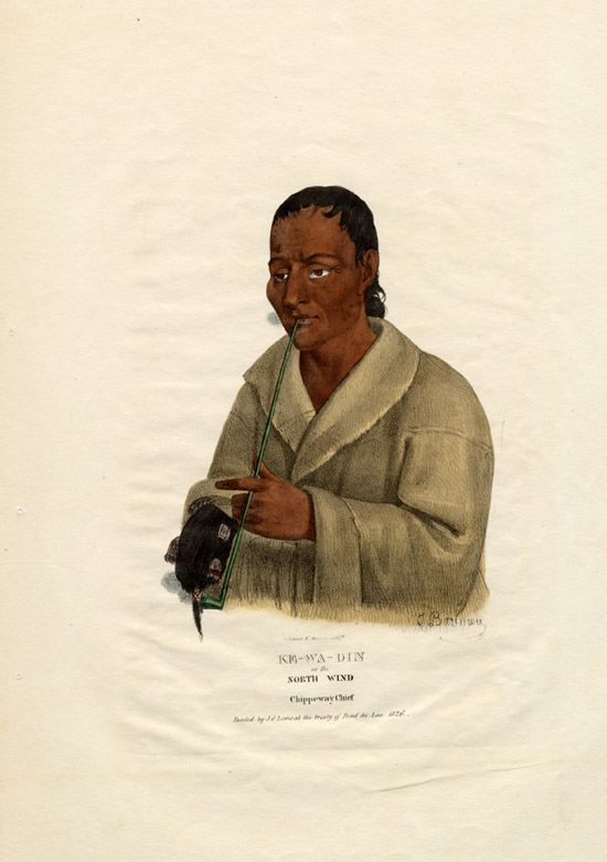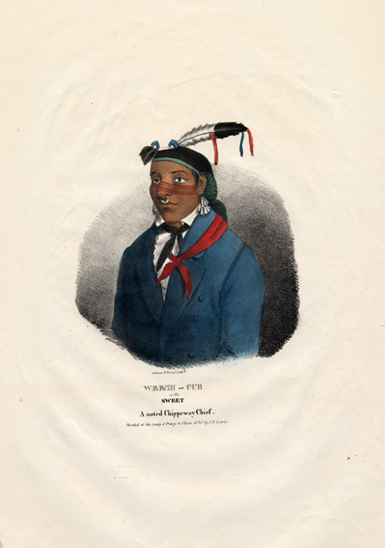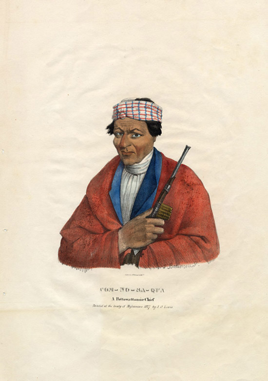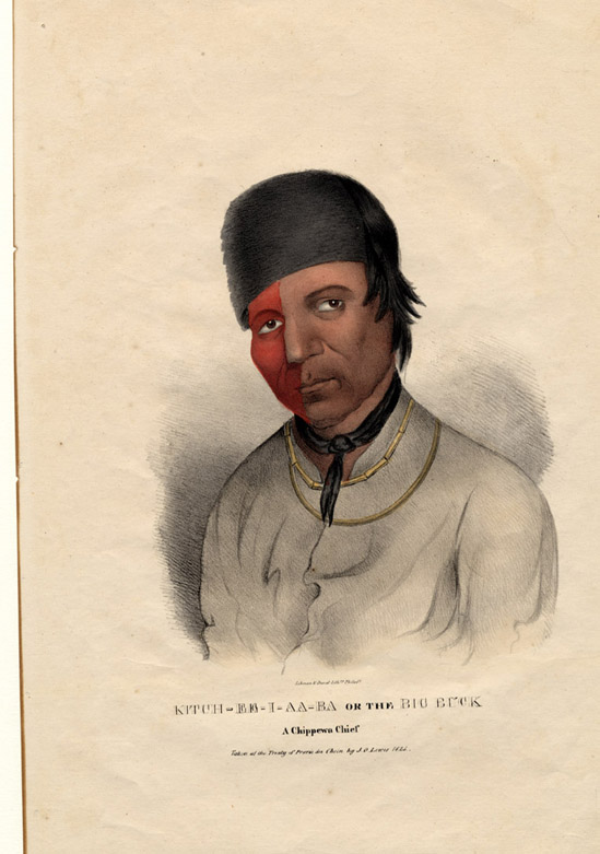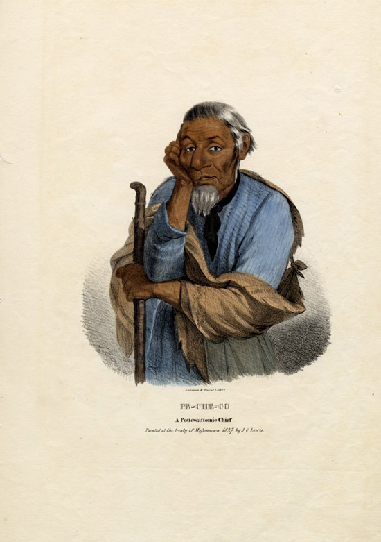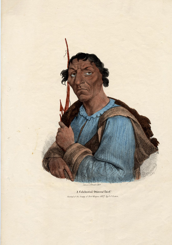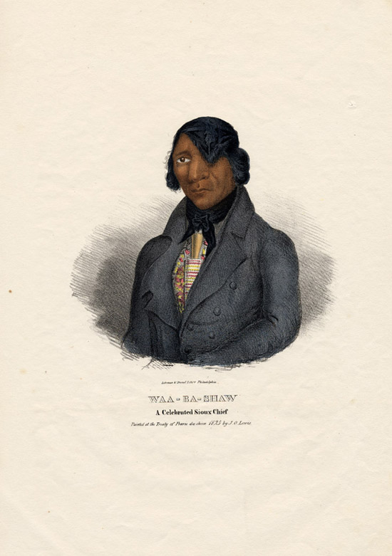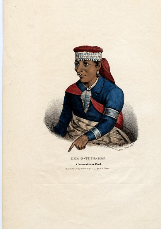 There does exist, however, for the 1820s a unique visual record of the signers that compliments their signature. One member of the federal government's negotiating party in the Great Lakes region was the artist James Otto Lewis (1799-1858). Lewis was commissioned to paint from life Indian leaders. Among others, he attended the proceedings at Prarie du Chien, Fond du Lac, and Butte Des Mortes. Overall Lewis painted more than three hundred portraits of the Native American leaders. A decade after the images were completed Lewis attempted to commercialize his work through a smaller series of approximately seventy published color lithographs.